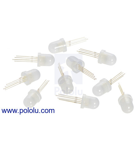 This 10-pack of 8 mm through-hole RGB LEDs offers an easy way to add colorful and complex lighting effects to a project. Each diffused LED features an integrated WS2811 driver that operates at 5 V and is controlled through a high-speed one-wire digital interface that allows multiple LEDs to be connected together to form a chain of addressable RGB LEDs.