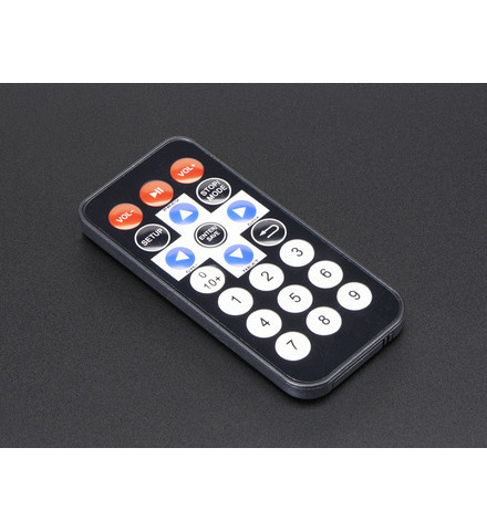 This small IR remote control emits a 38 kHz modulated IR signal that can be used to control a robot or other electronics project from across the room. It has 21 buttons, including directional and number entry buttons.