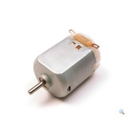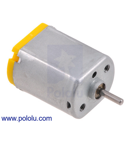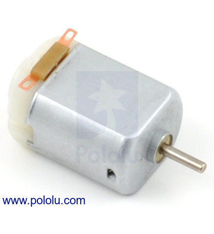 This 130-size brushed DC motor has a recommended operation voltage of 3 – 12 V and is used in the larger Pololu plastic gearmotors. Approximate specifications at 6 V: free-run speed of 11,500 RPM, free-run current of 70 mA, and stall current of 800 mA.