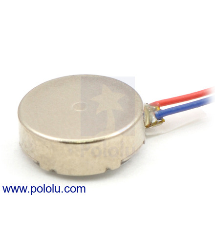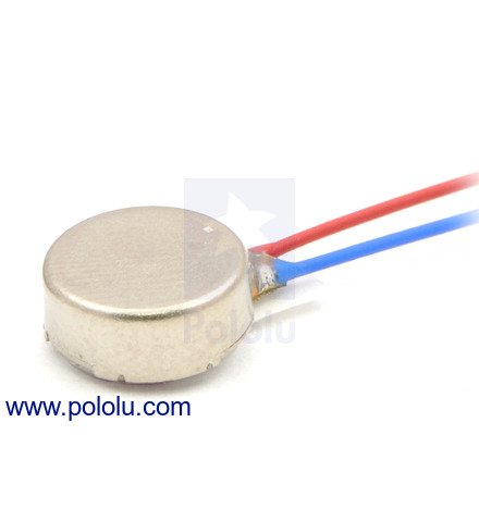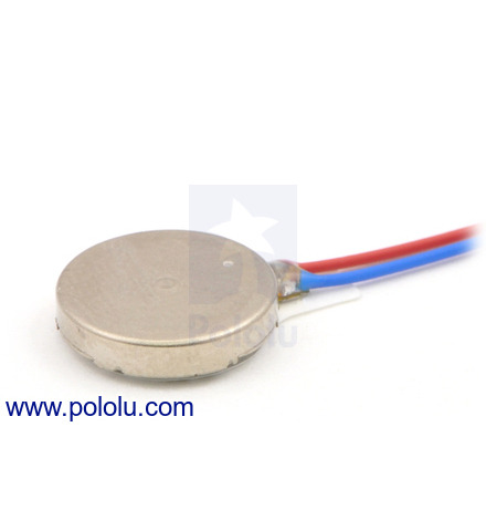 This tiny, button-type, vibrating motor shakes with a vibration amplitude of 0.75g and draws approximately 60 mA when 3 V is applied to its leads. The shaftless design keeps this motor small: 8 mm in diameter and 3.4 mm in height.