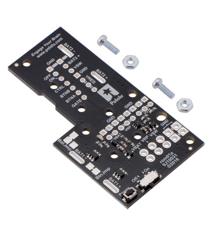 This power distribution board is designed specifically for the Romi chassis as a convenient way to access the chassis’s battery power and pass that on the rest of the electronics that make up your robot. It has slots for soldering directly to the chassis’s battery contacts offers reverse voltage protection, several power switching options, and easy access to the various power busses. Just add your own motor drivers, microcontroller, and sensors to complete your Romi robot.