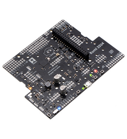 The Romi 32U4 Control Board turns the Romi chassis into a programmable robot based on the Arduino-compatible ATmega32U4 MCU. Its features include integrated dual motor drivers, a versatile power circuit, and inertial sensors, as well as connections for quadrature encoders and an optional LCD. The board also has the ability to interface with an added Raspberry Pi, making the foundation for a complete Raspberry Pi-controlled Romi robot.