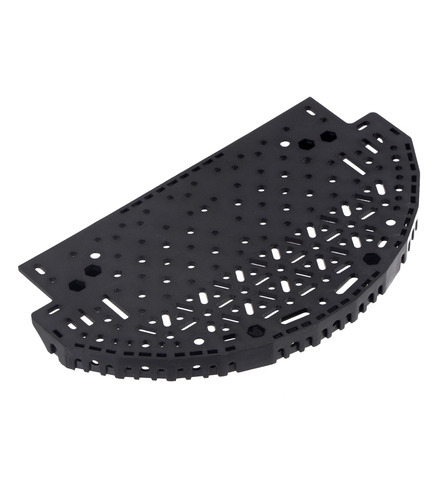 This Romi Chassis accessory offers a convenient way to expand your Romi robot vertically by adding new tiers. The expansion plate has the same diameter as the base plate, but we made it only a half circle to give you more expansion options. For example, when used as part of the Romi robot arm kit, it supports the arm in the back while leaving the front half of the Romi open. For a full-sized expansion platform, just combine two expansion plates. A mixture of mounting holes and slots give you the flexibility to mount components in a variety of orientations almost anywhere on the plate.
