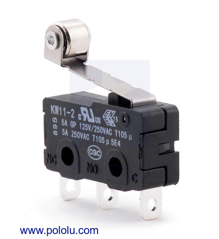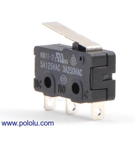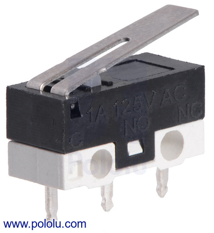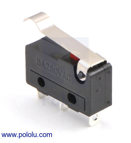This single-pole, double-throw (SPDT) momentary switch can be used as a general-purpose micro switch or tactile bump sensor for your robot. The switch body dimension is 20.0 x 6.4 x 10.2 mm, and the 16.3mm lever arm is has a roller at the tip.