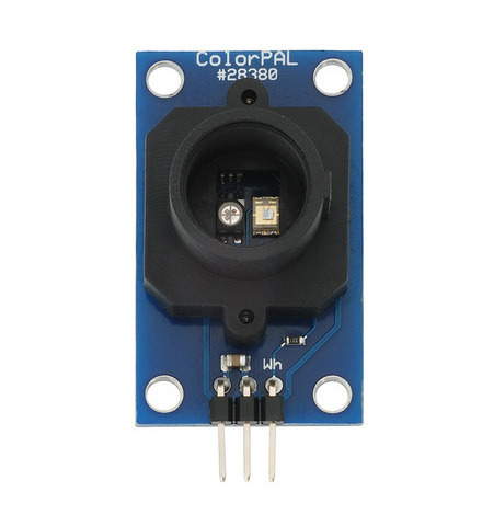 The Parallax ColorPAL combines an RGB LED, a light sensor, and a microcontroller to make a color sensor that can also be used as an ambient light detector and a color generator. Readings are reported via a 1-wire asynchronous serial interface.