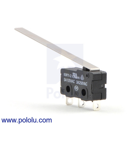 This single-pole, double-throw (SPDT) momentary switch can be used as a general-purpose micro switch, but the long lever arm makes it especially useful as a tactile bump sensor for your robot (e.g whiskers or antennae). The switch body dimension is 20.0 x 6.4 x 10.2 mm, and the lever arm is 50 mm long.