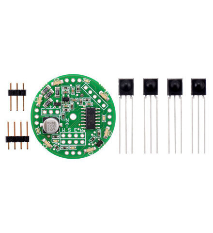 These sensors use pairs of infrared LEDs and phototransistors to measure how much of the emitted IR light is being reflected from a nearby surface. They are great for edge detection and line following.