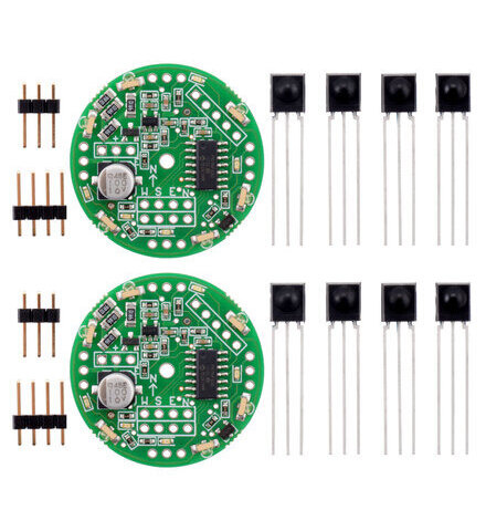 The Pololu IR beacon is a compact board that is used in pairs to allow robots to locate each other. Each board has infrared emitters that shine in all directions and four IR receivers for detecting the other beacon. The IR beacons have a range of about fifteen feet indoors. This item is for a pair of beacons in one package.