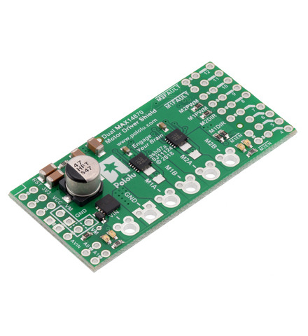 This small shield is an easy, economical way to control two small brushed DC motors with an Arduino or Arduino-compatible board. Its two integrated MAX14870 motor drivers allows it to operate from 4.5 V to 36 V, making it a great for higher-voltage motors and applications, and the shield can 1.7 A continuous (2.5 A peak) per motor. The shield can optionally be configured to power the Arduino from the same power supply as the motor driver, and the Arduino pin mappings can be customized (by cutting traces) if the defaults are not convenient.