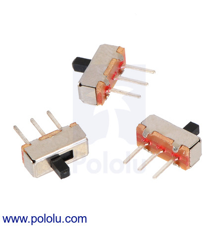 These small single-pole, double-throw (SPDT) slide switches are rated for 300 mA at 50 VDC and make great on/off power switches for low power electronics. They can also be used as a convenient way to choose between two analog or digital input signals. The three pins have a 0.1″ spacing that works with standard solderless breadboards. These switches are sold in packs of 3.